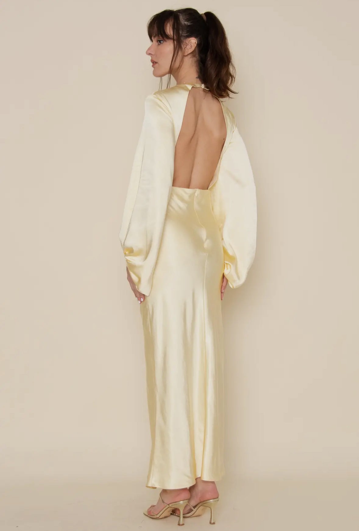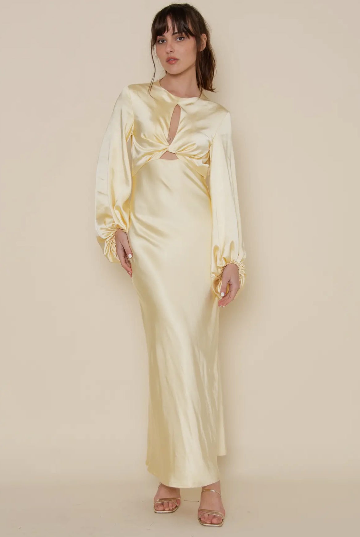 Introducing the Della Balloon Sleeve Maxi. This stunning gown features a round neckline, chest cut out with front knot, and long balloon sleeves for a dramatic look. The form fitting design and pale pastel yellow color make it a perfect choice for a day party or as a guest at a bridal season event. Complete with a button closure behind the neck, open back, and zipper closure for a luxurious finish. Made with high-quality 100% polyester for ultimate comfort and style. Elevate your wardrobe with this beautiful statement piece.