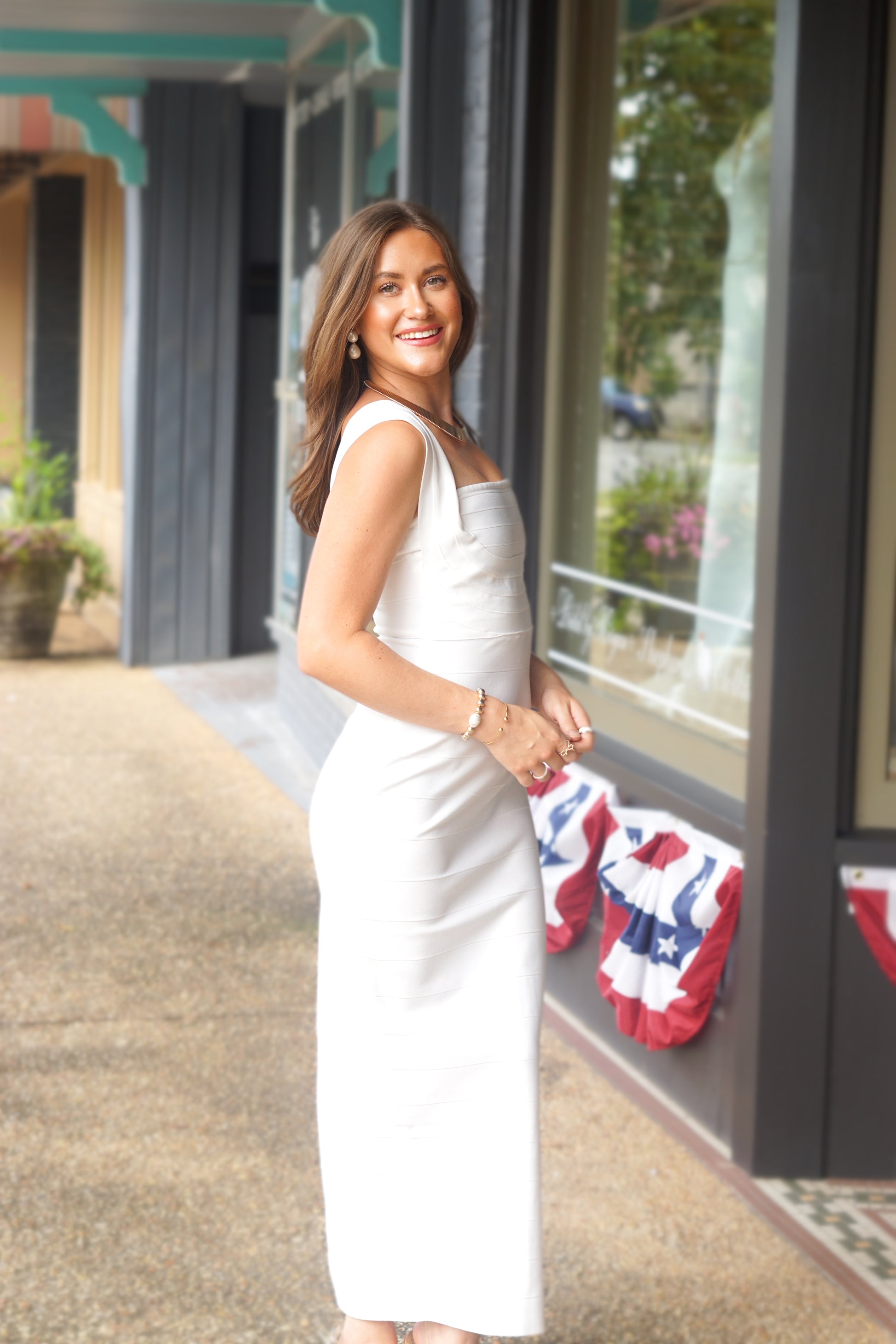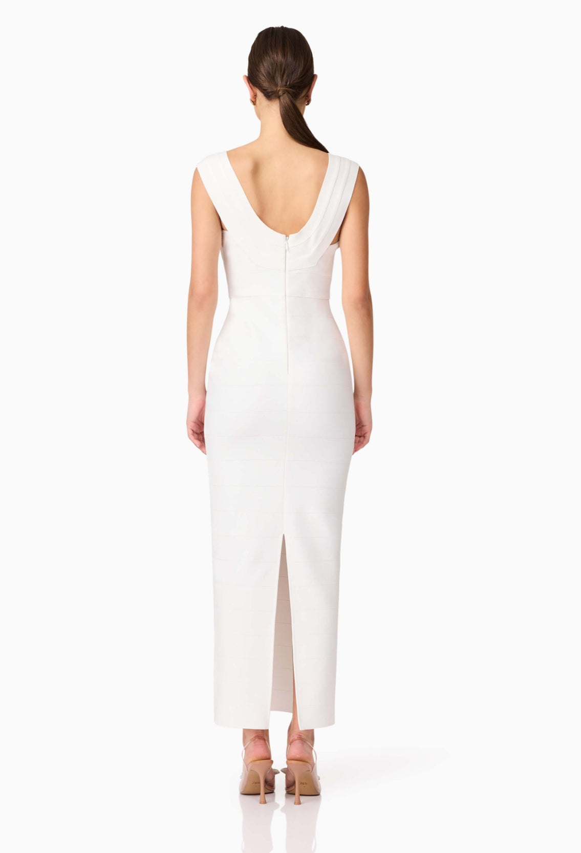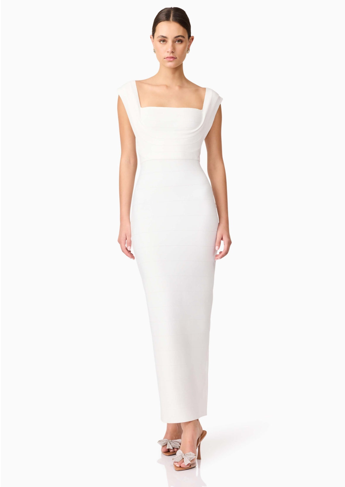 Exude elegance and grace in our Fiona Maxi Dress. The stunning bandage wrap silhouette accentuates your curves, while the luxurious fabric gives a flattering and sophisticated look. Perfect for any bridal event, this dress will make you feel exclusive and sophisticated. Dry clean only. Fabric offers stretch. Model is wearing a small.