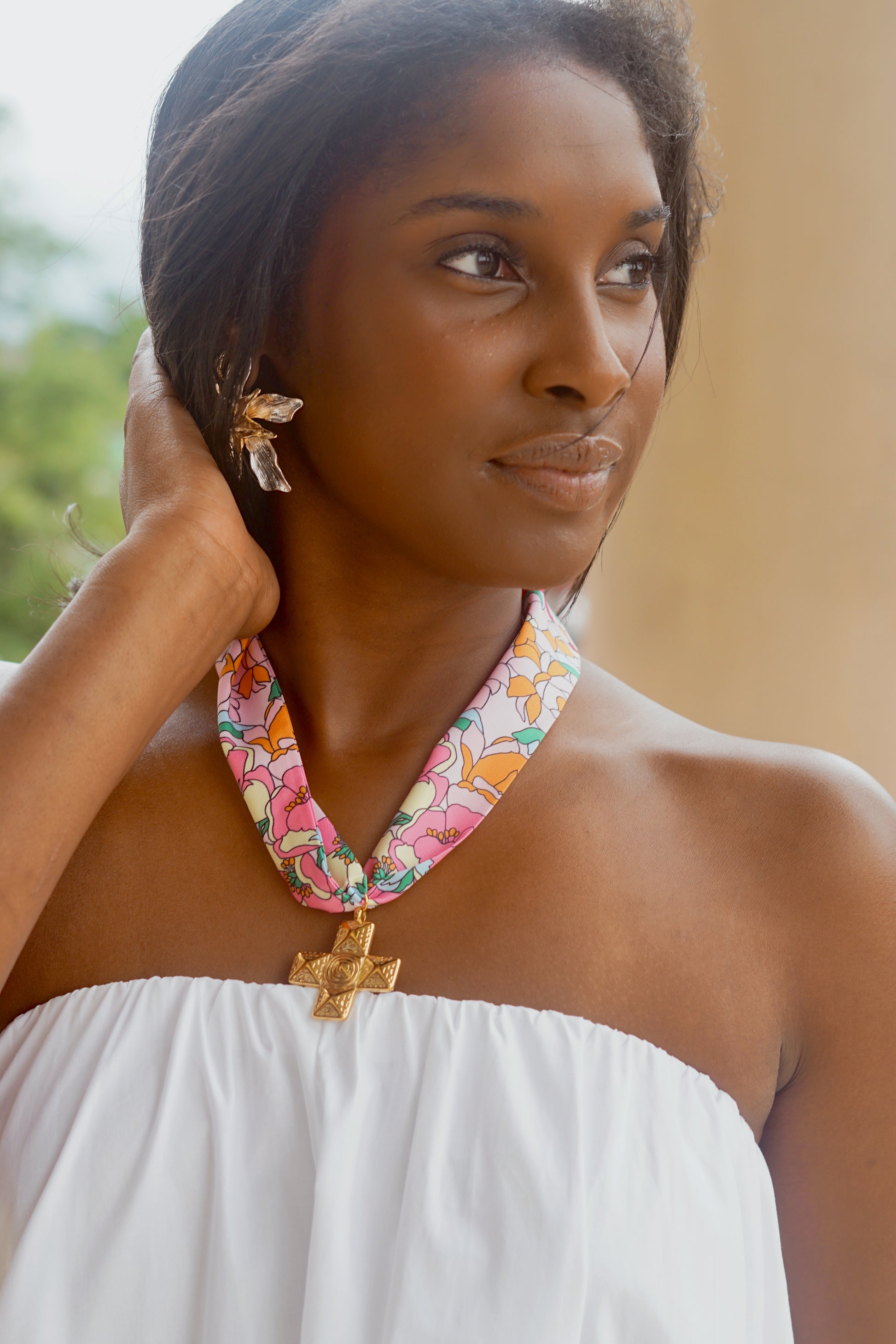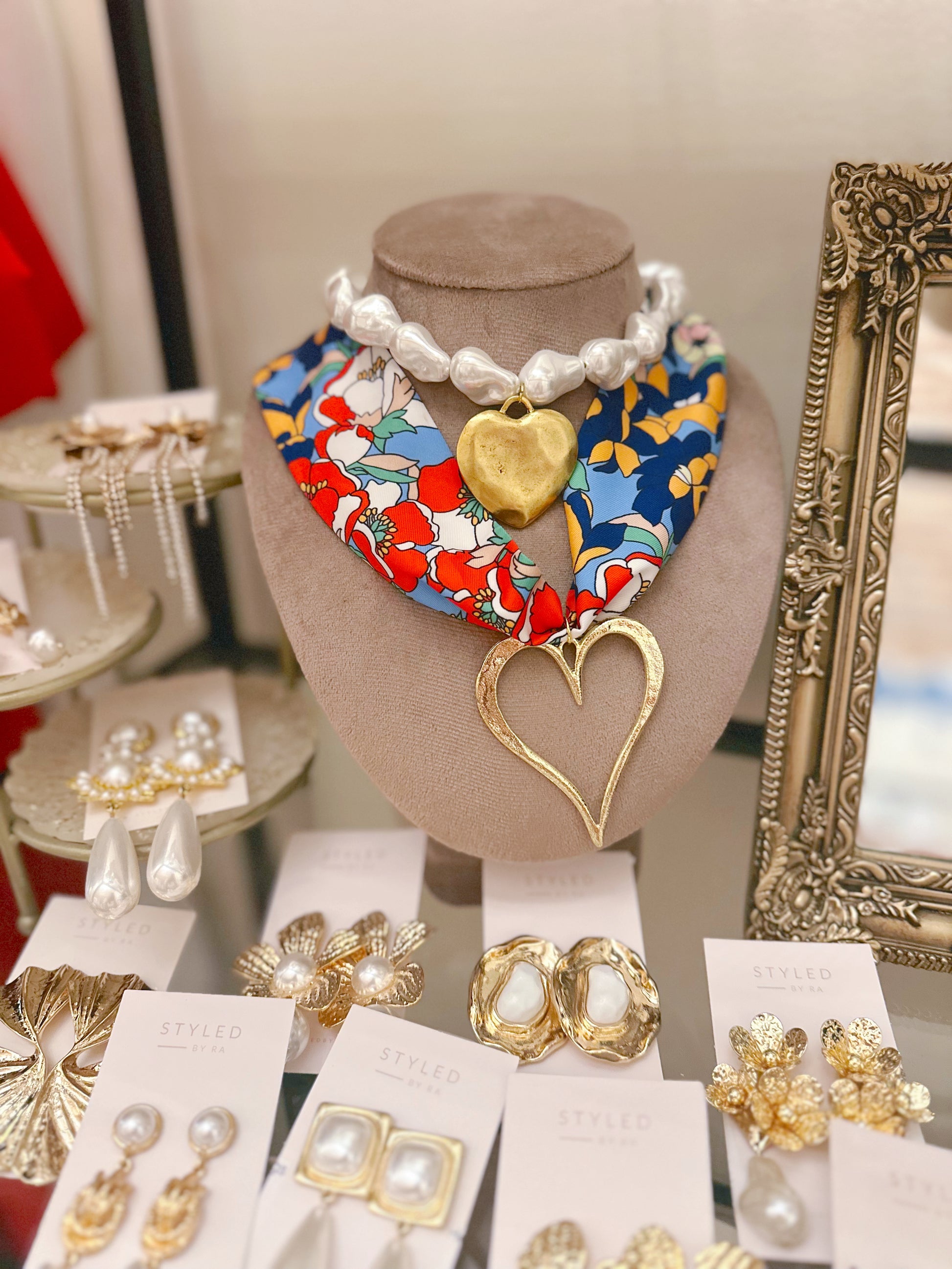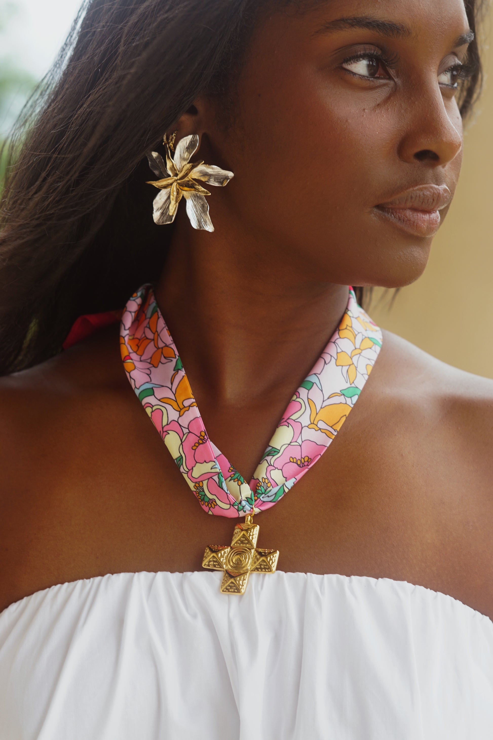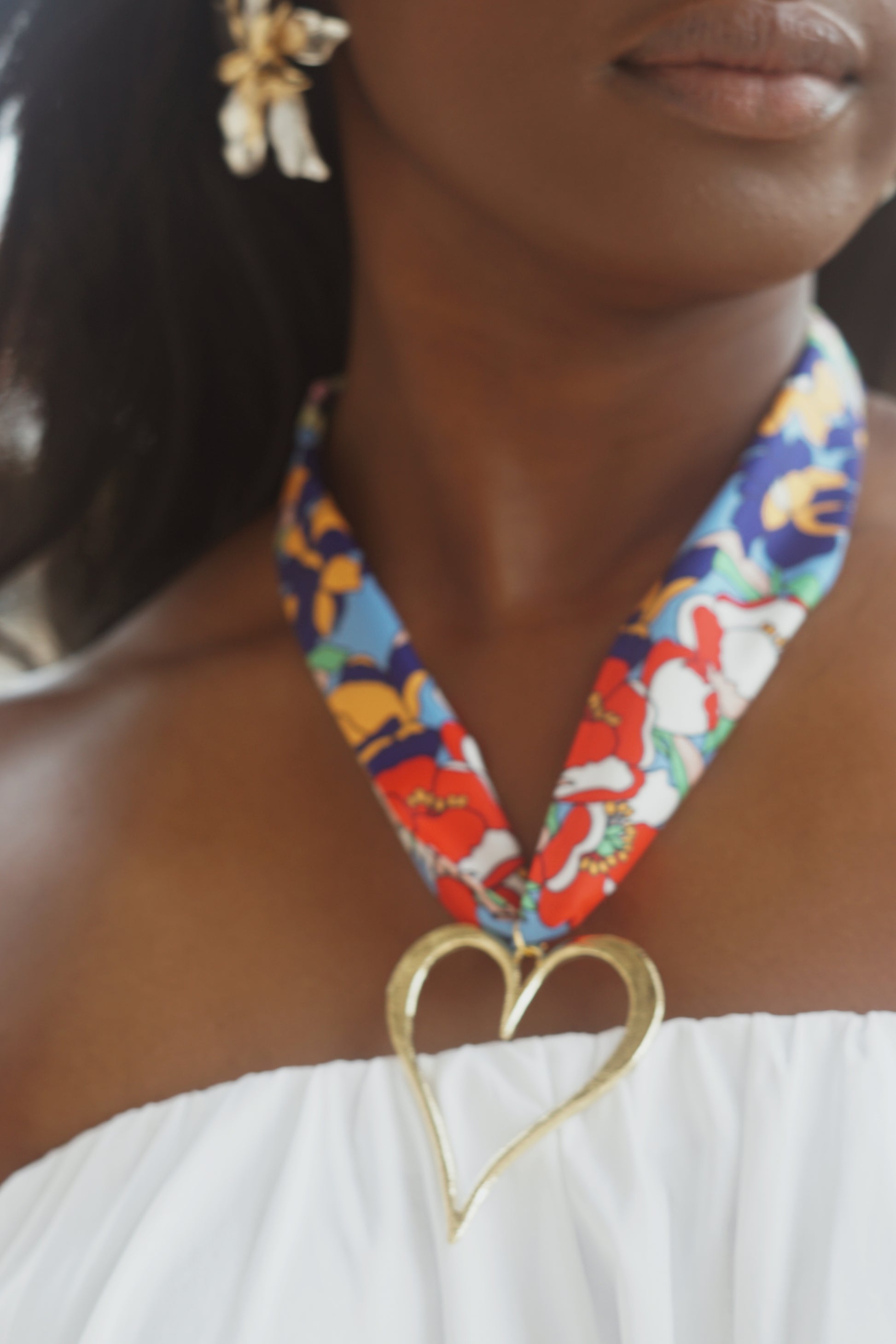 Introducing the Floral Scarf Necklace, the must-have accessory for the fashion-forward. Handcrafted in north Alabama, this chic piece effortlessly combines a scarf and necklace, adding a splash of color to your look. Elevate your style with this exclusive, one-of-a-kind piece.