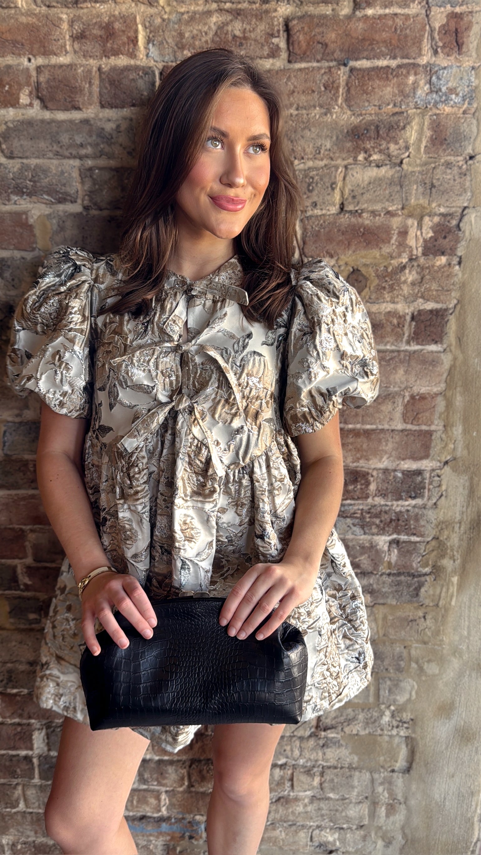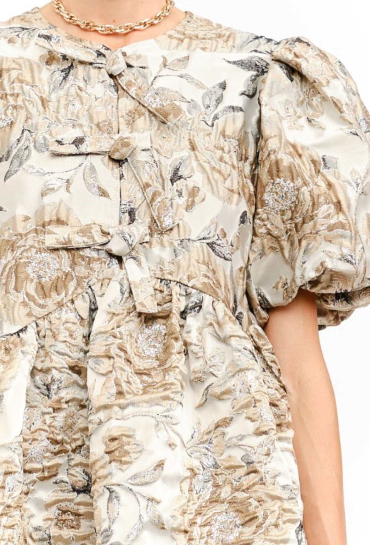 Make a statement this fall and winter with Mirelle Mini, a floral printed jacquard babydoll mini that sparkles in mixed metals gold and silver. Show off your unique style and turn heads wherever you go. A must-have for any fashion-forward individual looking to make a bold and confident statement.