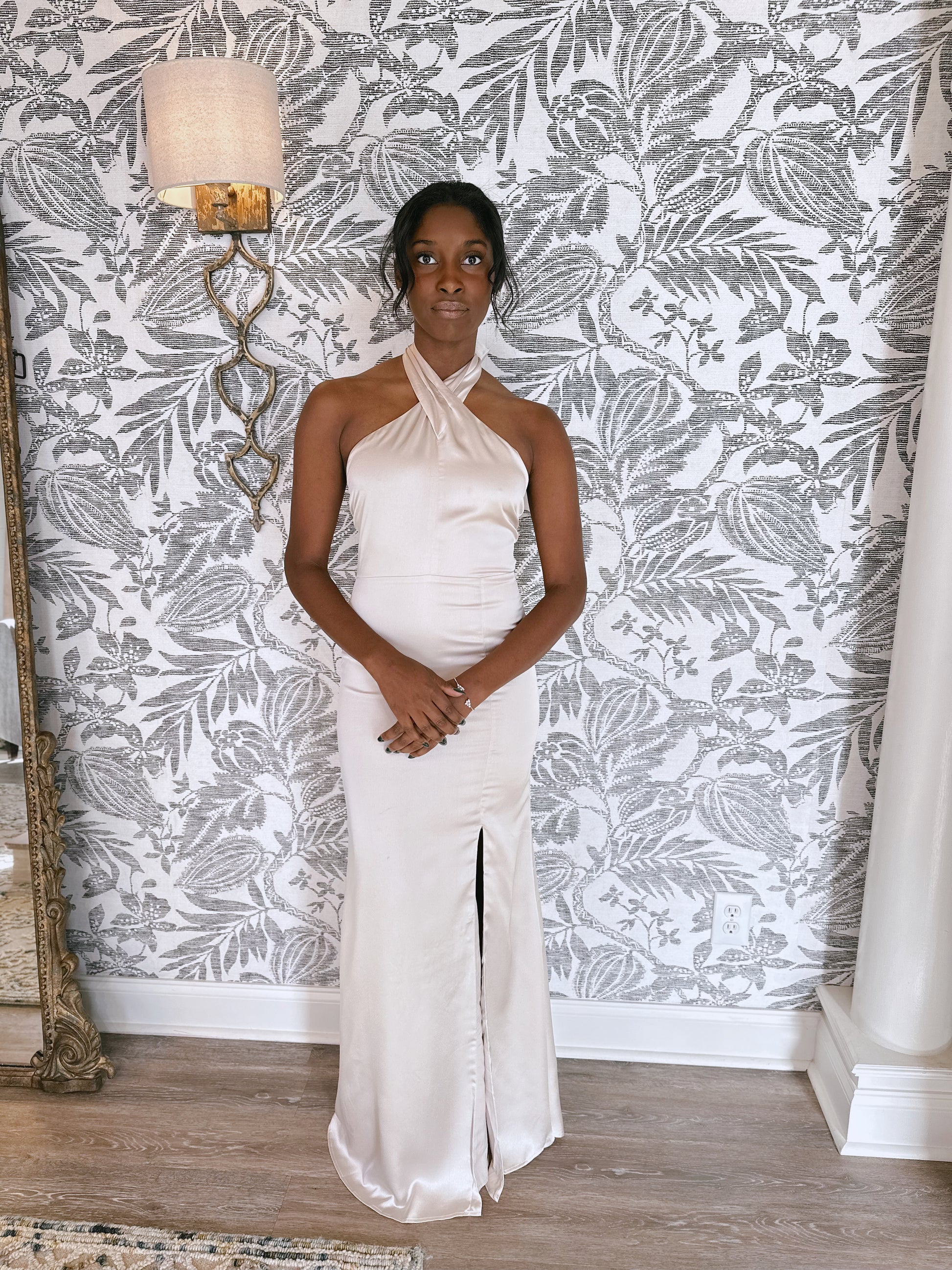 Elegant, classic style with a satin fabric. Halter neck with that ties around the neck!