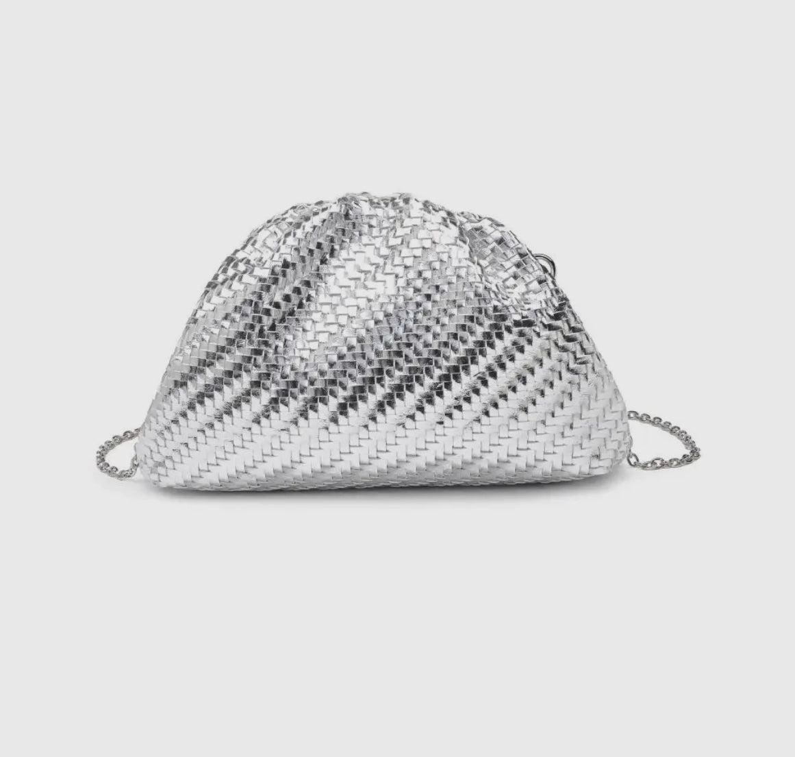 Elevate your evening attire with our sophisticated vegan leather clutch. Featuring a unique half-moon shape and a stylish woven design, this clutch is adorned with a detachable chain strap for versatile wear. Inside, the fabric-lined interior includes a zip pocket, making it as practical as it is chic.
